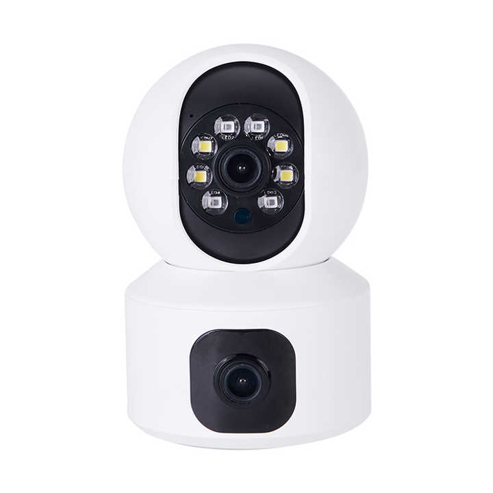 1.دو لنز مستقل برای نظارت جامع: دوربین V380 دو لنز به شما امکان میدهد تا تصاویر را از دو زاویه متفاوت به صورت همزمان مشاهده کنید. لنز پایین ثابت است و لنز بالایی قابلیت چرخش ۳۶۰ درجه دارد، بنابراین هیچ زاویهای از دید شما پنهان نمیماند. این ویژگی مخصوصاً برای والدین یا مدیران اماکن حساس بسیار کاربردی است.